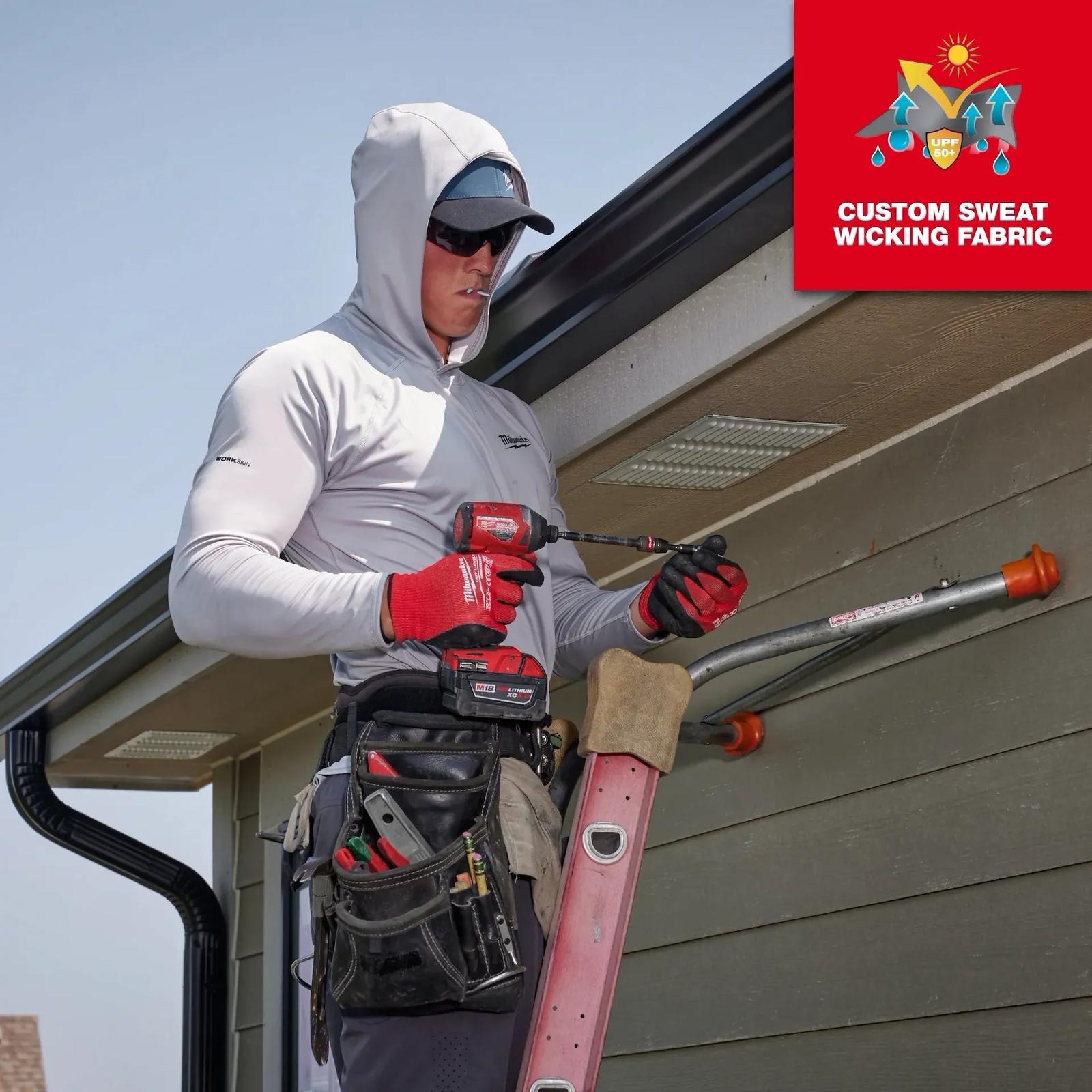 Part of the MILWAUKEE® WORKSKIN™ Collection, our Hooded Sun Shirt is BUILT TO FIGHT SWEAT. Engineered with a custom sweat wicking fabric, the WORKSKIN™ Hooded Sun Shirt is designed to keep you dry and comfortable. Complete with UPF 50+ sun protection and odor fighting technology, this Sun Shirt is perfect for hot summer days on the job. Milwaukee® WORKSKIN™ products are developed in collaborating with feedback from users across the trades through continuous jobsite research.