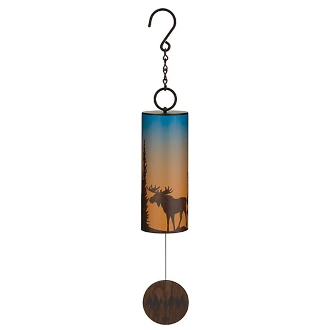 A setting sun scene with an animal walking in the woods adorns this rich tubular Wind Bell. Complete with hook and chain, and an engraved wood sail.
